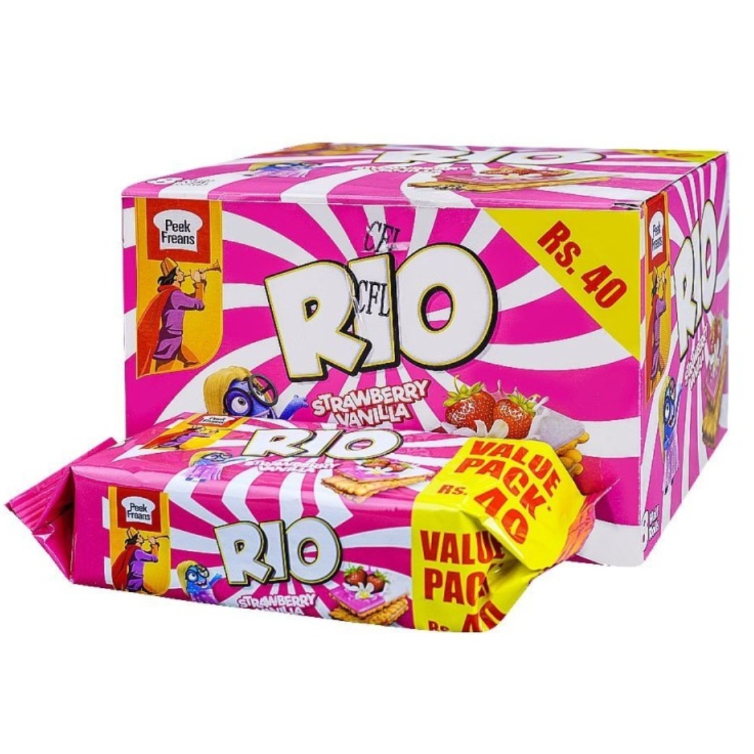 Peek Freans Rio is a popular, creamy sandwich biscuit brand in Pakistan, launched in 1995, renowned for its “double treat” of creamy fillings—most notably strawberry-vanilla—sandwiched between two crunchy, light biscuits. It is primarily a sweet, kid-favorite snack known for its vibrant, dual-colored cream filling and indulgent texture